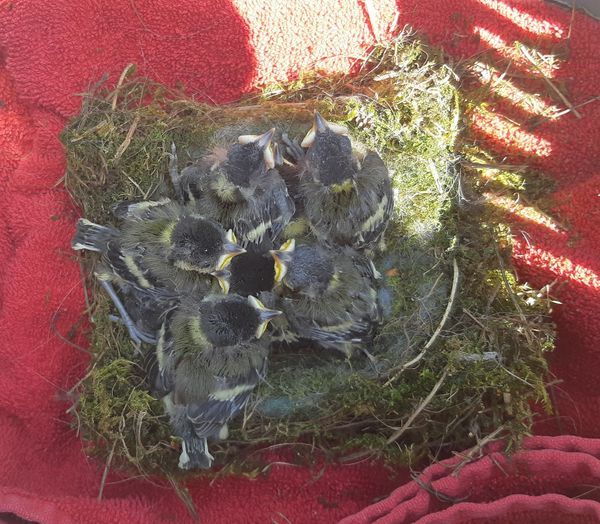 Corina heeft heel voorzichtig de koolmeesjes inclusief het nestje voorzichtig uit het vogelhuisje gehaald en in een vervoersbakje gedaan. De koolmeesjes deden direct hun snaveltjes open omdat ze dachten dat ze eten zouden krijgen, want ze hadden honger.
